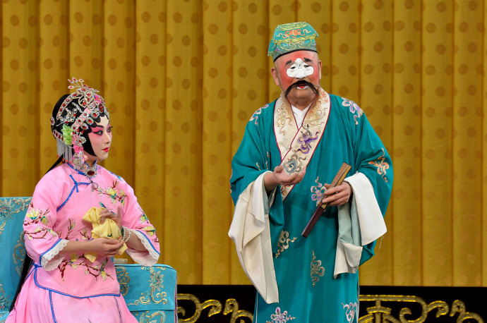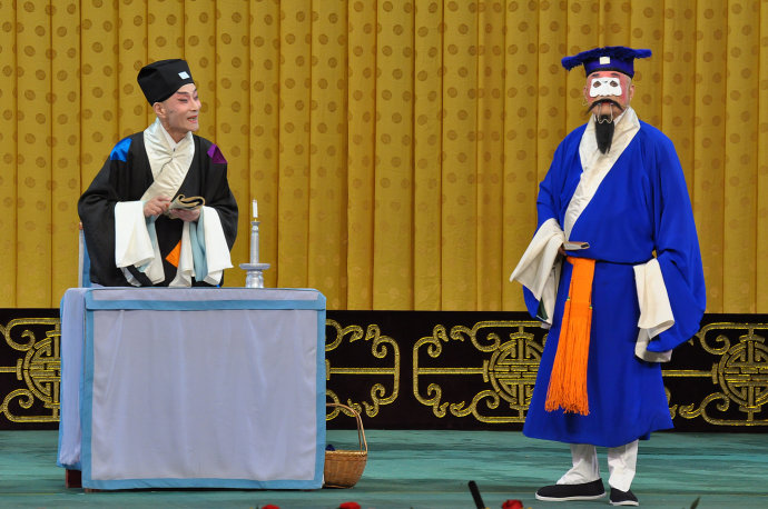 四折《连升店》,也是名剧。人知萧老夫子和姜先生合作录音,本场乃由二萧合作,亦有渊源。润年同志供职上京,年轻时能应武角,予听其嗓音稍左,念稍做作,有刻意学乃祖处,而其连升店之店家,则要好于他戏,昔见配像时即由二君合作,虽未赶上其祖指点,也多心得。而润德同志之小生,虽嗓音未见激昂,提气使嗓总显用力,然唱念有法,做戏细腻,予视其王明芳,见店家之诺诺,背躬处摇首暗叹,而贵有书卷气,正合文生气质,一笑一蹙,皆有和气。场上先上小生,出场有好,“蓬蒿隐蔽灵芝草”,一句念对儿即有蕴藉。待店家一句“啊哈”,台下已有反响,“孟尝君子地店”、“不打发闲钱”出门几句,虽有刻意也见学祖余荫。进店几番央告,丑角之傲倨,小生之隐忍,二萧皆有配合。进草房,小生求灯,一句“灯来了”之吟咏也有掌声,唱两段吹腔,引店家,待店家丢书时,小生拾书时向圣贤赔罪之做功,可见酸腐。后面丑角一段开讲,此处丑角展示念工,娓娓道来,仿佛夫子。只词句有减,只讲“冠者五六,童子六七”一番,二番丑命小生伏案、打呼噜,问睡着没有?小生答睡着了。丑诘问睡着还说话?小生起身京白答:你问我嘛。既合书生身份又带怨气,俨然知识分子。后面报录高中,店家与崔老爷一段逗哏,前面张永生串崔,帽头大褂坎肩,效果亦大方。待丑角寻至柴房,三番盘问知王老爷中,弹衣正冠,种种巴结,萧演来极尽能事,台下反响不小。换衣穿靴,穿袖时二人使相,旧鞋上龛供祖,辛辣讽刺。直至店家三番送王老爷,小生骂其势利小人。丑角自言骂到心缝,才有“错把茶壶当夜壶”之叹,悻悻而下。全场此出可算整齐,小生儒雅斯文,丑角虽有火气,倒也合小人气质,二萧合作不简单。