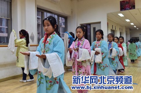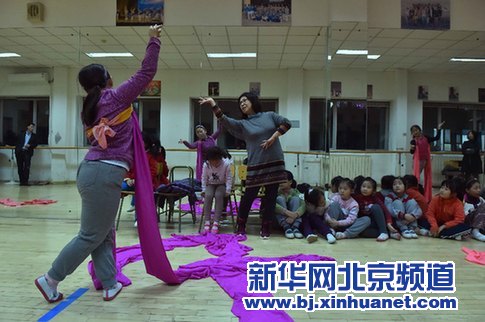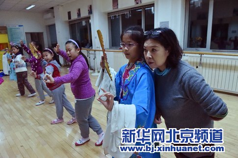 11月11日,于淑敏在北京实验学校教学生唱戏时,仔细听她的唱腔。