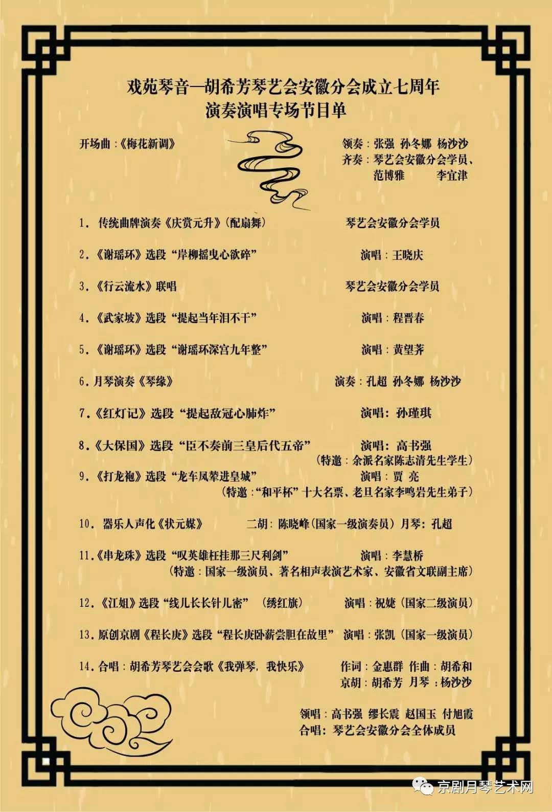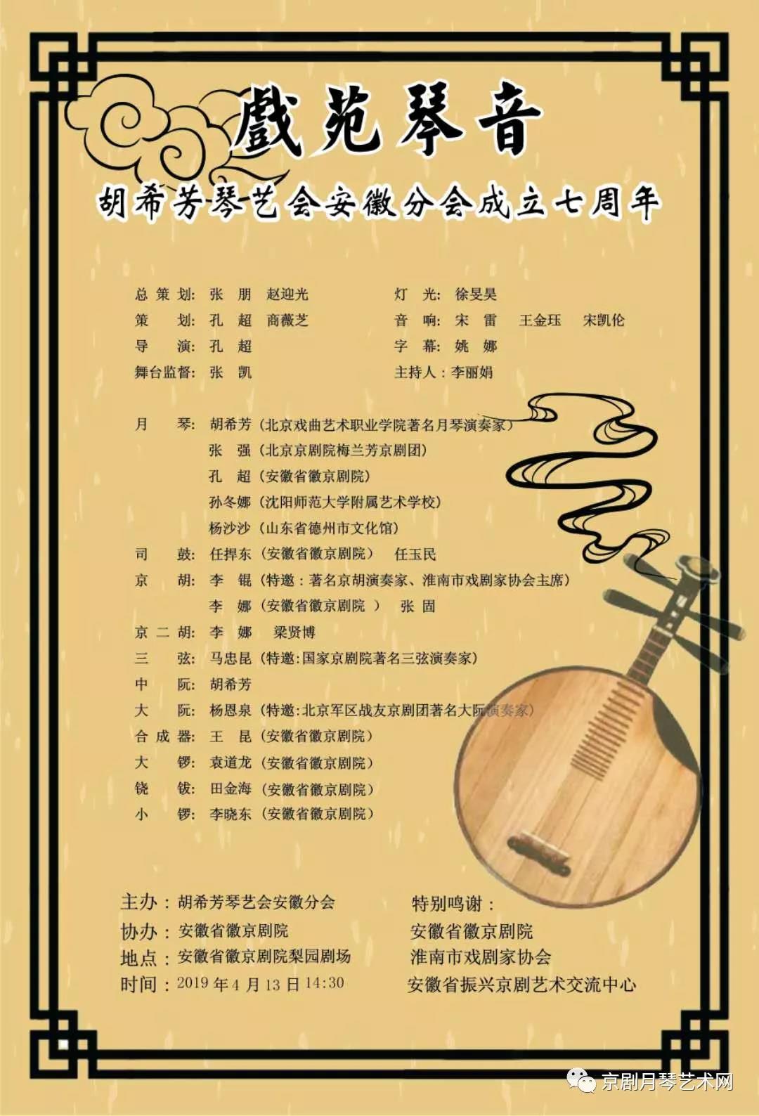 2019年4月13日安徽省徽京剧院梨园剧场即将举行胡希芳琴艺会安徽分会成立七周年专场演出,欢迎广大朋友前往观看.