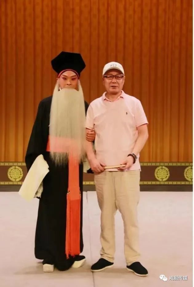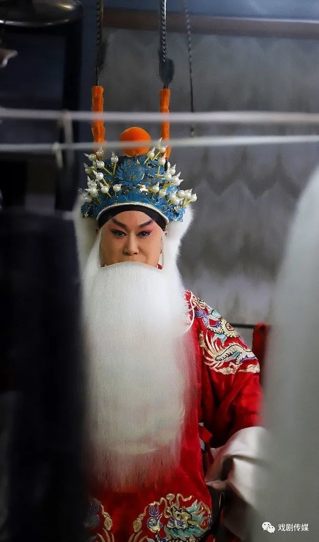 《白帝城》是奚派代表剧目,张军强先生结合自身嗓音优势,无论是西皮还是二黄都有自己的一些处理。唱腔始终饱满清澈、通透适中,高音大气刚劲、低音温润如玉,玉音金腔,骨肉交错,血气浑然,余音绕梁,将刘备为弟报仇的“恨”、兵败势衰的“悔”、创业未半中道崩的“怨”以及弥留托孤的“虑”刻画得入木三分。听张军强先生的奚派唱段,如激赏“洞箫大美”,一腔入耳便入脑回响,入心长存。著名学者、艺术家欧阳中石先生作为其授业恩师对张军强先生寄语时,也是不吝辞藻:“习得神韵,奚师即灵可以含笑矣。”张军强先生在从艺五十周年庆典活动中演出《珠帘寨》片段,图为后台留影