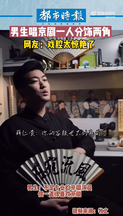 10月25日,湖北武汉。一名男生在宿舍唱京剧,一人分饰戏中的男、女两个角色。男生表示:自己不是专业的,但从小热爱京剧,希望通过短视频让更多年轻人喜欢上京剧。