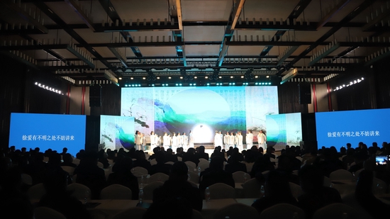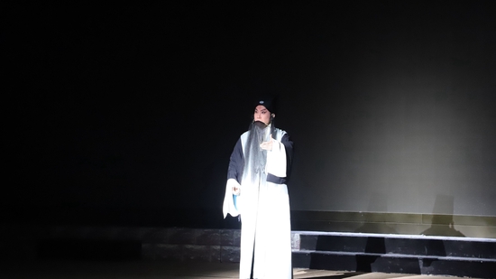 舞台上,随着《杖刑贬逐》《荒山瘗旅》《龙场悟道》《讲习布道》《此心光明》几场戏的层层递进,悟道之旅徐徐展开,冯冠博以老生大文戏造型、新编唱腔,生动诠释了鲜活、厚重的阳明先生形象。青黛色的崇山峻岭、雾气缭绕的阳明洞、清冷的玩易窝等酷似实景的舞台布景,有着独具贵州地域的诗意之美,实现了哲学思想在京剧舞台的完美呈现。
