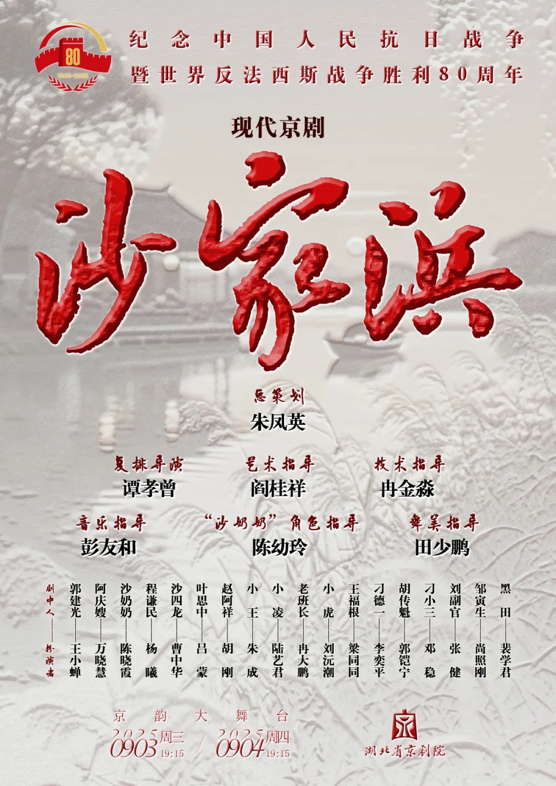 八十年前,烽烟散尽山河重光,抗战胜利铸就民族丰碑;今日,经典重现致敬峥嵘岁月!为纪念中国人民抗日战争暨世界反法西斯战争胜利 80 周年,湖北省京剧院将在 9月3日、9月4日 带来现代京剧《沙家浜》!