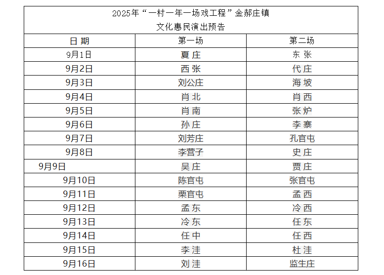 为进一步丰富群众精神文化生活,提升基层公共文化服务水平,由中共临清市委宣传部、市文化和旅游局主办,市京剧团承办的2025年“一村一年一场戏工程”文化惠民活动,将于9月1日走进金郝庄镇,为广大群众送去丰富的戏曲和歌舞表演等节目。