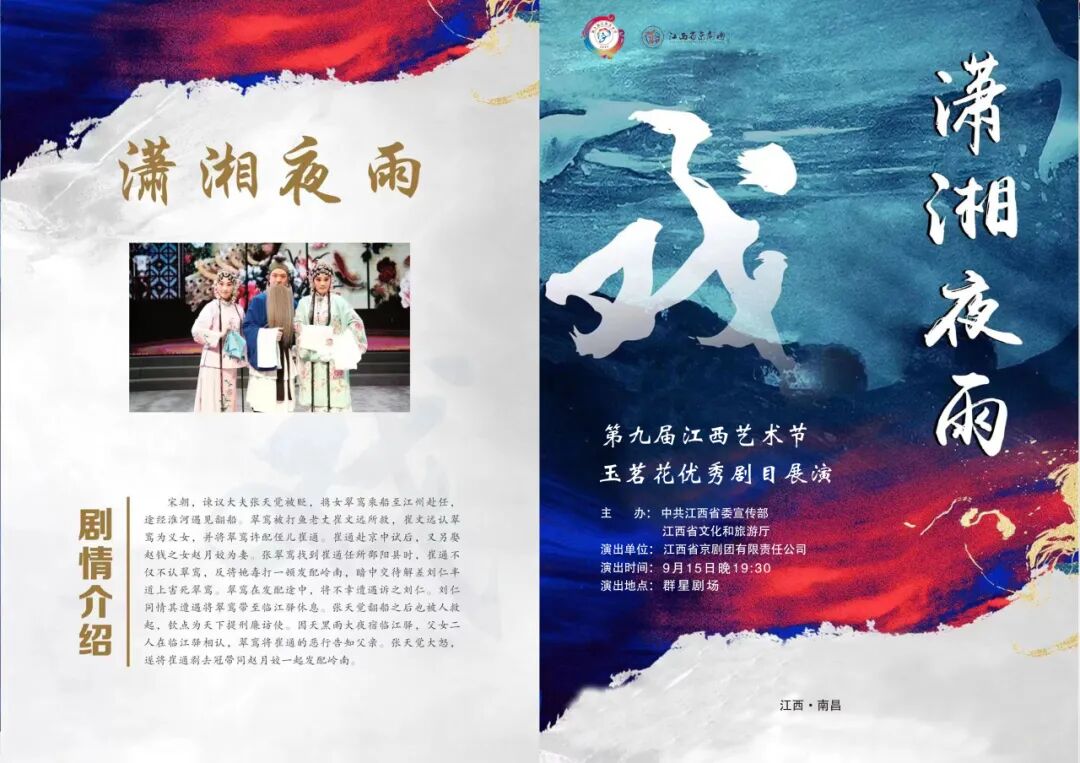 第九届江西艺术节·玉茗花优秀剧目展演精彩持续,江西省京剧团重点复排的经典京剧《潇湘夜雨》,将于9月15日19:30在群星剧场正式上演,诚邀广大戏迷与市民共赴这场兼具思想性、艺术性与观赏性的京剧盛宴。