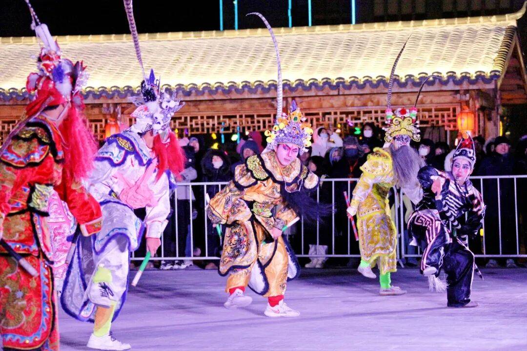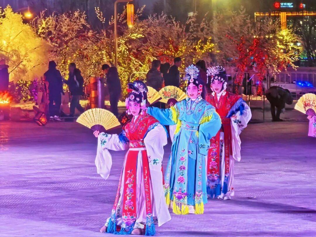 英歌的雄浑余音未散,一缕婉转的乐曲轻轻飘来。《梨园芳华》的演员翩然登场。水袖如云,髯口轻扬,在渐深的夜色里勾勒出戏曲独有的韵味。接着,吉林市本土京剧精彩亮相。武生出场,锣鼓点密如急雨,银枪舞动似蛟龙出海,对打时的兵刃相击之声清脆响亮,把京剧武戏的力道展现得十足。“好功夫!”台下喝彩连连。