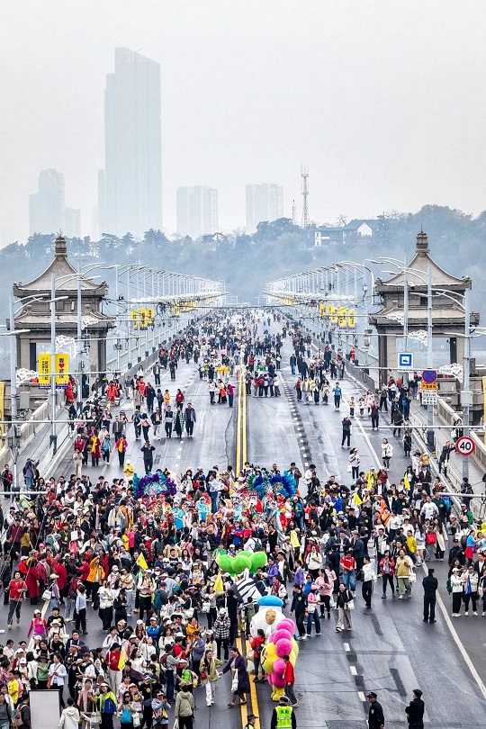 身着华美戏服、勾画精致脸谱、头戴专业行头,武汉京剧院的演员们步履轻盈、身姿绰约,与汉剧院、楚剧院同仁并肩,组成50人戏曲巡游天团,成为长江大桥上最吸睛的风景线。