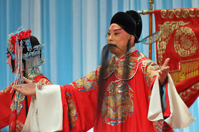 此戏男主则为穆居易,实为佐配旦脚,江其虎演,也尽辅弼之力。唱工不重,多为散唱,只“洞房”时有流水板,也要唱得摇曳生姿,婉求娘子。此角倒是换装不少,“郊游”唱戴如意巾,着青素褶,“拜寿”换藕粉花褶,是为吉服。“书房”时换戴学士巾,湖色花褶,手持书卷,稍显隆重。后面及至“赠银”、“投军”等场,均如是装。“大帐”一场,换戴武生巾、硬褶,示其从戎,“保媒”场则纱帽、粉蟒,有了官阶。“洞房”场去蟒换帔,新郎官打扮。小生前面戏份无多,见雪雁惊介,后面听闻提婚,对元帅、监军虚与委蛇,不敢得罪,几番背躬、甩袖,以示不满。洞房之中,对大媒洋洋不睬,话无好气,自有分寸,今人演来或多撒放,以合效果,曾见某学姜(妙香)老艺人载文专题凤还巢之小生念做,以洞房时对媒人,水袖欲摔又收,照顾官阶身份,也有讲究。江为团配日久,也有光彩,予听其对元帅、监军几番对答,虚字话料,竟像叶(少兰)师,又有新观。于副院长配演元帅洪功,近时其多为配佐,以院职助团,自有风格,台上则演戏少而讨俏角色,观者也有收获。果然“大帐”一场,字幕一出,座中即有反响。待于氏帅盔红蟒而出,掌声不少,此场无多,无非念诗道白,副院长也认真尽职。“保媒”时换戴纱帽、持扇,与监军一唱一和,说成大媒。“洞房”又来,与监军进房,自讨座位,几番问答程、穆翁婿,全然相声卸“包袱”法,三番两次,问出私奔情由。副院长也能做戏,煞有介事,气急持扇打程浦纱帽壳儿,对监军无之奈何,几番“问问去”,周走几人之间,却也有戏。此末场俊“洞房”,有赖两老生一花脸一小生,穿插做戏,才更有趣,予听配像录音时,已感梅剧团存音中风趣盎然,遑论先贤。只看今时台上,白口、做戏能有声色,属实少见。