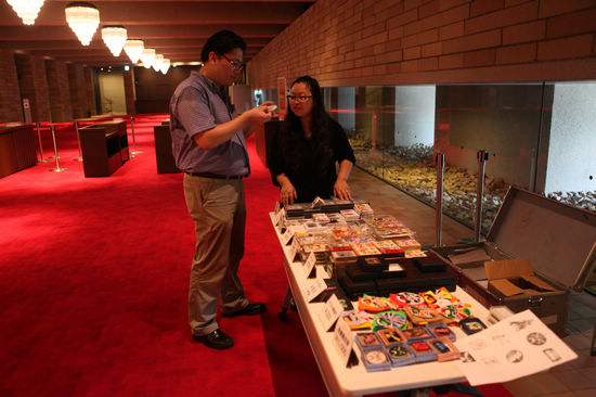 工作人员正在作京剧纪念品售卖的准备工作