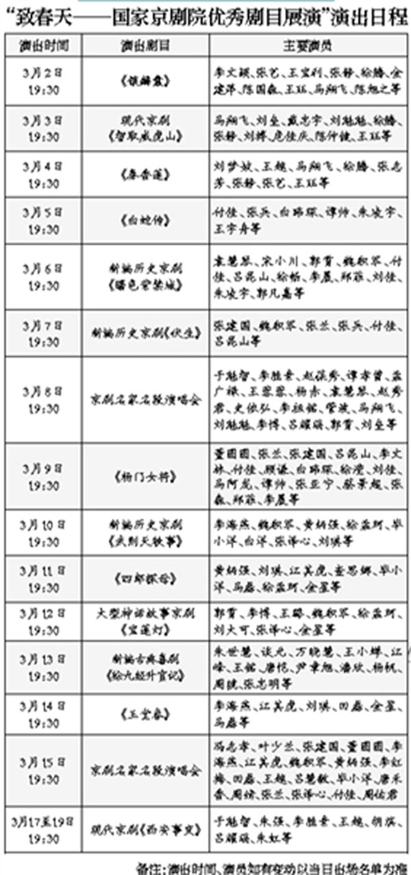 展示当今京剧最强阵容、新势力及薪火传承的“致春天”演出品牌,自2014年推出以来,已连续举行了两年,32场演出引来3万观众“驻足”,成为春节演出“盛夏”后的又一抹梨园“春色”。3月2日至19日,由国家京剧院主办的“致春天——国家京剧院优秀剧目展演”将在梅兰芳大剧院上演,17场演出将以底蕴深厚的剧目和演员强档为国粹艺术添彩。