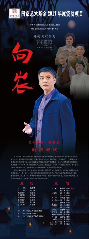 原创京剧《向农》是江苏省演艺集团京剧院2017年度重点剧目,特邀著名京剧表演艺术家、二度梅得主、江苏省京剧院原院长陈霖苍执导,本剧由青年编剧魏强改编自著名编剧孟冰的经典话剧《枫树林》,著名作曲家续正泰谱写音乐及唱腔,并邀请北京京剧院领衔主演、老生名家杜镇杰饰演男主角向农。