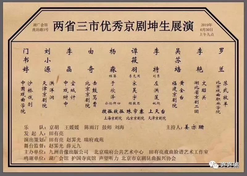 为振兴京剧,弘扬国粹,展示坤生艺术,由九州文化传播公司、瑞府公共文化艺术中心和田有亮脸谱艺术工作室共同主办的《两省三市优秀京剧坤生演唱会》,于2019年6月30日(周日)上午在北京湖广会馆成功举办,受到观众的热烈欢迎。