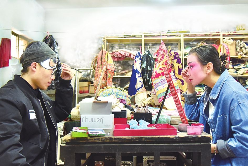 梳大头、贴片子,眉梢往上这么一吊,那精气神就出来了。外行看热闹,不明白这么做的意义,只觉得这么扯,皮肤肯定很痛,忍不住跟着心头一揪。“记得第一次冬天下乡演出时,片子准备好了,结果温度太低,上脸的时候都有冰碴了。”吴双在化妆的同时,笑着讲述自己的经历。