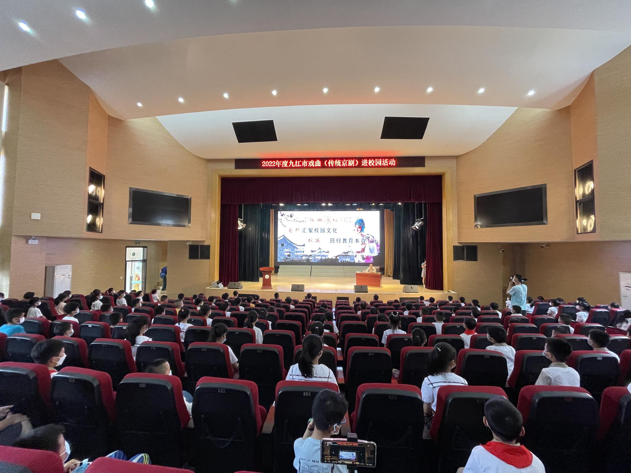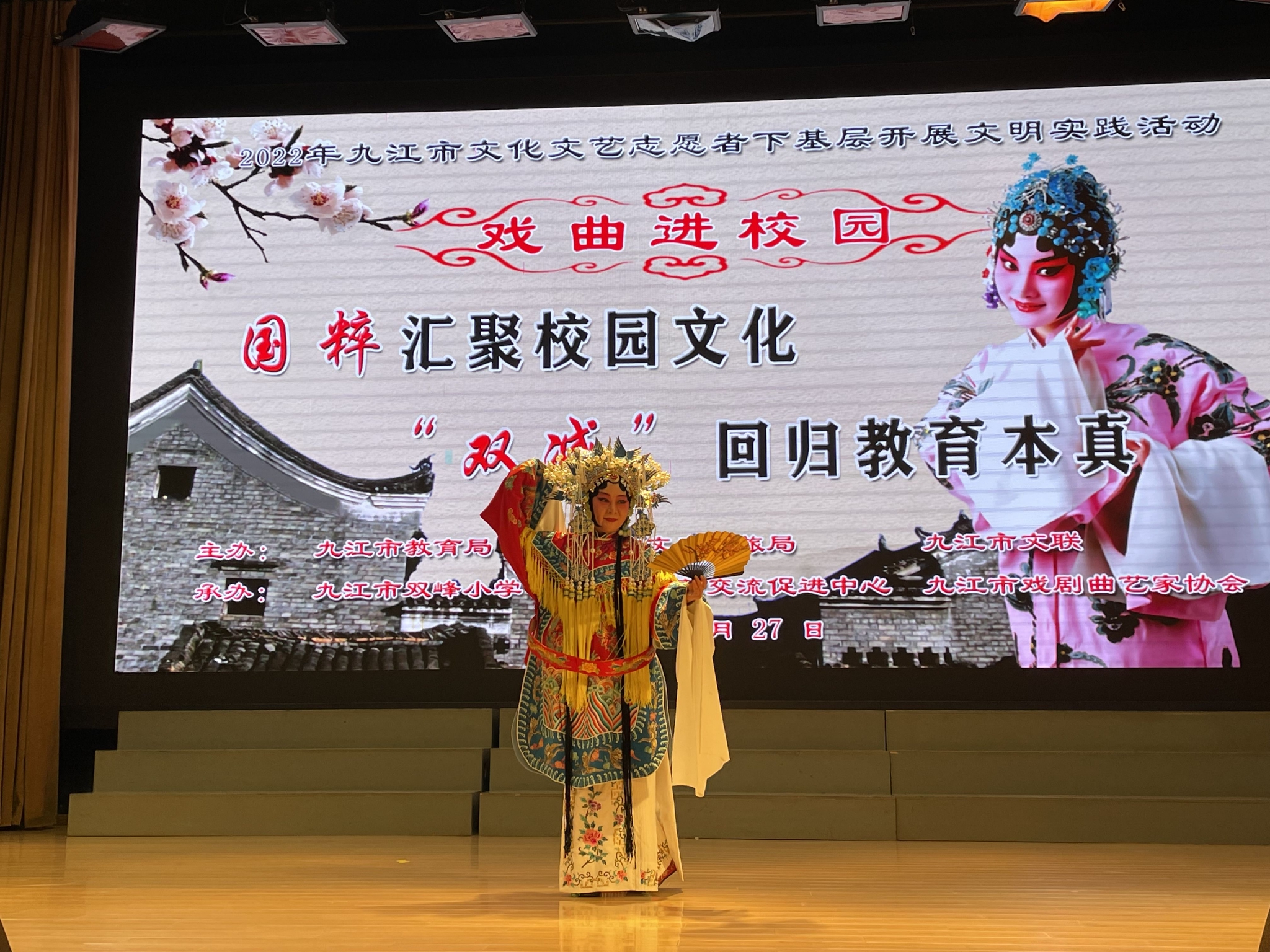 国粹汇聚校园文化,“双减”回归教育本真,为弘扬国粹,传承戏曲经典,让学生近距离接触和了解戏曲文化,感受中华优秀传统文化的博大精深,5月27日上午,由九江市文广新旅局、九江市文联、九江市教育局联合主办,九江市演艺交流促进中心、九江市戏剧曲艺家协会、九江市双峰小学承办的戏曲进校园活动在双峰小学新校区小剧场举行。