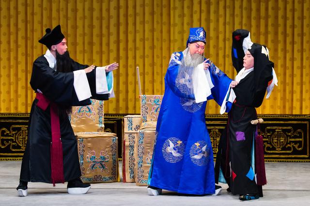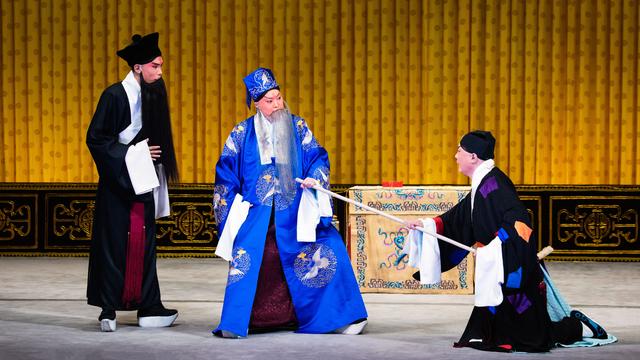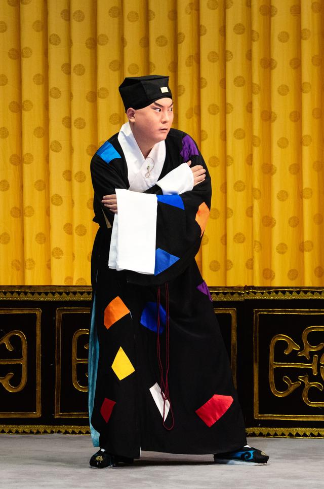 这场《状元谱》是谭筱羽同周晓盟的第二次合作演出,相比第一次演出,二人在细节上的打磨更为精致,例如打侄时二人的默契程度都较第一次有很大提升。二人在扮相上也有所调整提高,谭筱羽这次前半出身着一身宝蓝色云纹鹤团大缎员外帔,一派富贵气象。周晓盟的扮相遵循传统,陈大官不化妆,清水脸,勒头月亮门较低,而且腰间所系绦子恢复了传统样式,体现出了陈大官落魄、穷困之状。可见演员们之用心,每次都在细微之处进行调整,完善着这出戏的品质。《状元谱》剧照 谭筱羽饰演陈伯愚、周晓盟饰演陈大官 摄影 孙觉非