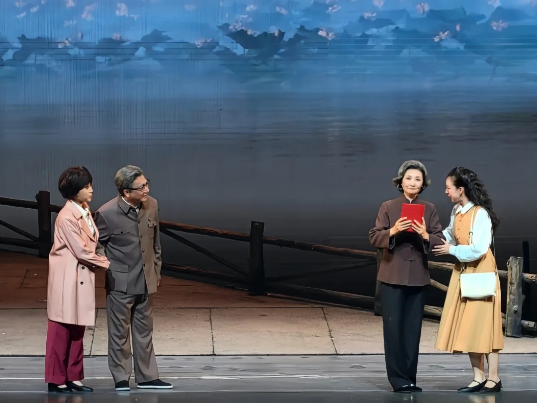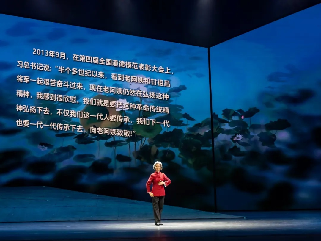 《老阿姨》以70年壮阔岁月为叙事轴线,在遵循艺术创作规律的基础上,深度融合京剧程式化身段与虚拟化场景的独特魅力,通过细腻的舞台语言,演绎人物与时代场景的交织与共鸣。剧目以老阿姨晚年翻阅日记的回忆自述作为切口,巧妙而快速地将观众带入到剧情当中。演出接近尾声时,龚全珍老阿姨获得“第四届全国道德模范”荣誉称号,这位“献出莲藕方倒下”的老阿姨毕生奉献的崇高精神,以震撼人心的艺术形式呈现在了观众的眼前。