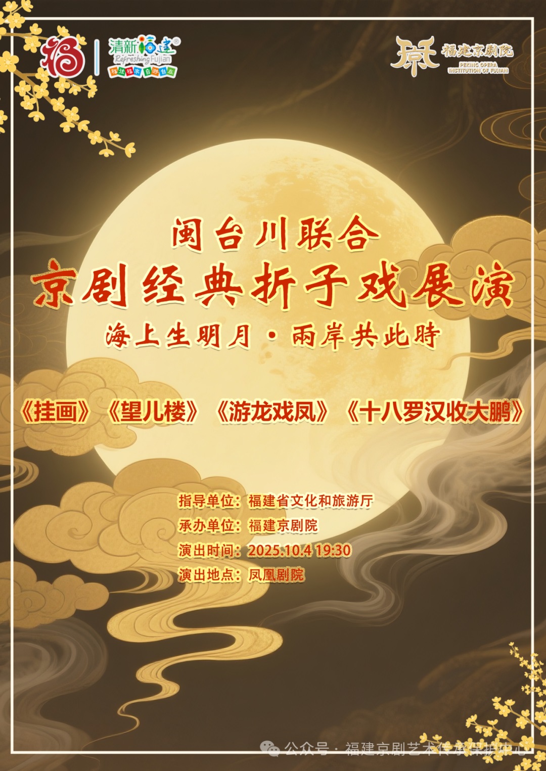 “海上生明月,两岸共此时”——闽台川京剧经典折子戏展演,将于10月4日19:30在福州凤凰剧院亮相。本次演出汇聚中国台湾、福建与四川的京剧名家与优秀青年演员,联袂呈现多出京剧经典折子戏,为广大戏迷奉上一场跨越地域的艺术盛宴。