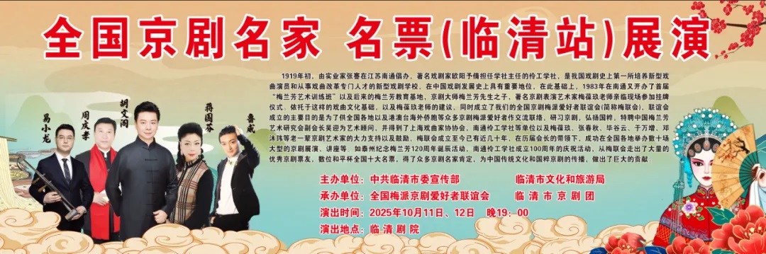 “汇聚名家力量、传承京剧经典”由中共临清市委宣传部、临清市文化和旅游局主办,中国梅派京剧爱好者联谊会、临清市京剧团承办的全国京剧名家名票(临清站)展演活动,于2025年10月11日、12日晚7:00在临清剧院开演。此次展演活动不仅集结了全国范围内的京剧名家与优秀票友,更依托临清本土的京剧文化根基,旨在通过专业舞台呈现,让传统京剧艺术焕发新活力,为当地及周边观众搭建近距离感受国粹魅力的平台,推动中华优秀传统文化在基层的传承与普及。活动期间,观众将有机会欣赏到名家名票带来的经典选段与精彩演绎,沉浸式体验京剧艺术的独特韵味。