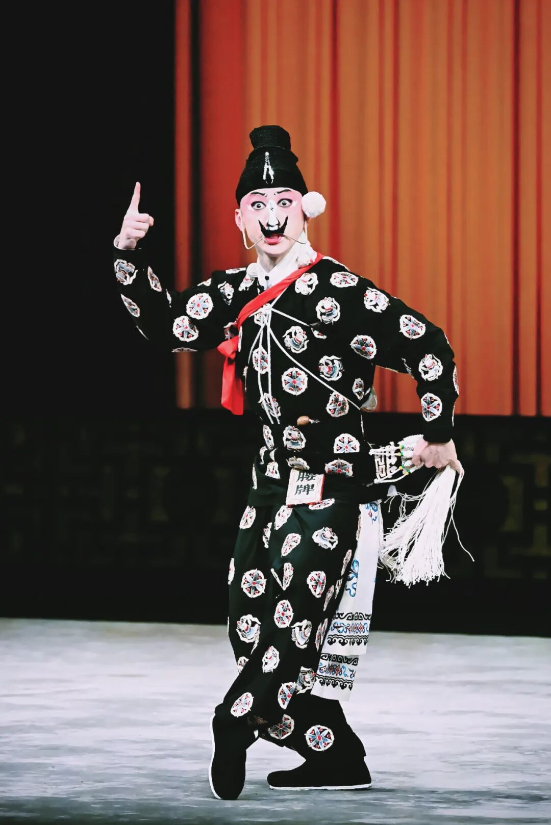 台上鼓点如楔,待那“四击头”最后一锣劈落,便是角儿登场——只见一人亮相,头戴黑色鬃帽,鬓插“英雄胆”,面勾白鼻梁,眼窝描黑如深潭,短打劲装裹身,足蹬薄底快靴,行走时弓背缩颈,十指如钩探物,一个鹞子翻身轻盈落地,倏忽挤眉弄眼,似笑非笑间透着市井狡黠,活现“鼓上蚤”轻巧诡谲的神韵。这是京剧演员郝杰跟师父严庆谷学的第一出戏《盗甲》,也是他武丑人生的正式开端。
