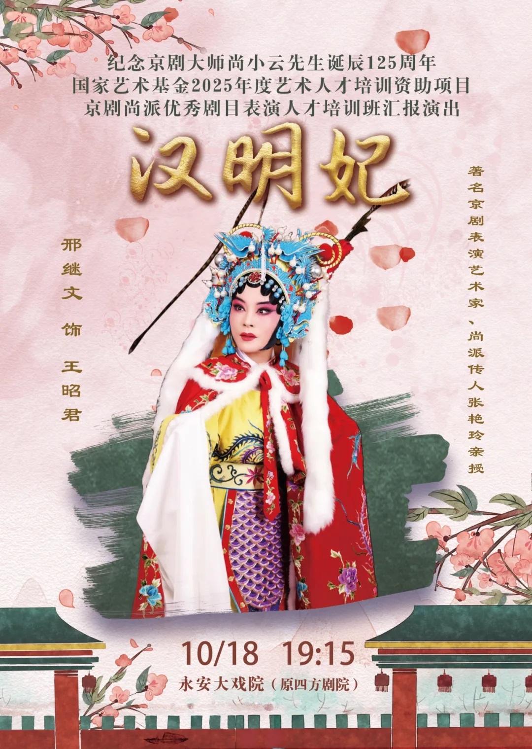 纪念京剧大师尚小云先生诞辰125周年,国家艺术基金2025年度艺术人才培训资助项目, 京剧尚派优秀剧目表演人才培训班汇报演出《汉明妃》,由尚派优秀青年演员邢继文演出京剧《汉明妃》,10月18日,青岛永安大戏院不见不散!