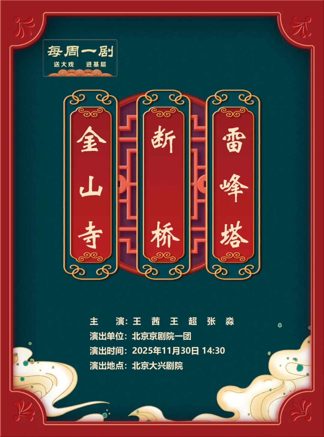 “每周一剧”送大戏进基层演出每部剧目将由多位优秀青年演员共同担纲主要演员,以好剧目、低票价,走进基层、服务百姓为宗旨,让更多百姓近距离体验京剧,让优秀青年京剧演员深入基层,通过全年进基层演出集中展示北京京剧院青年人才培养成就和发展后劲。剧情介绍
