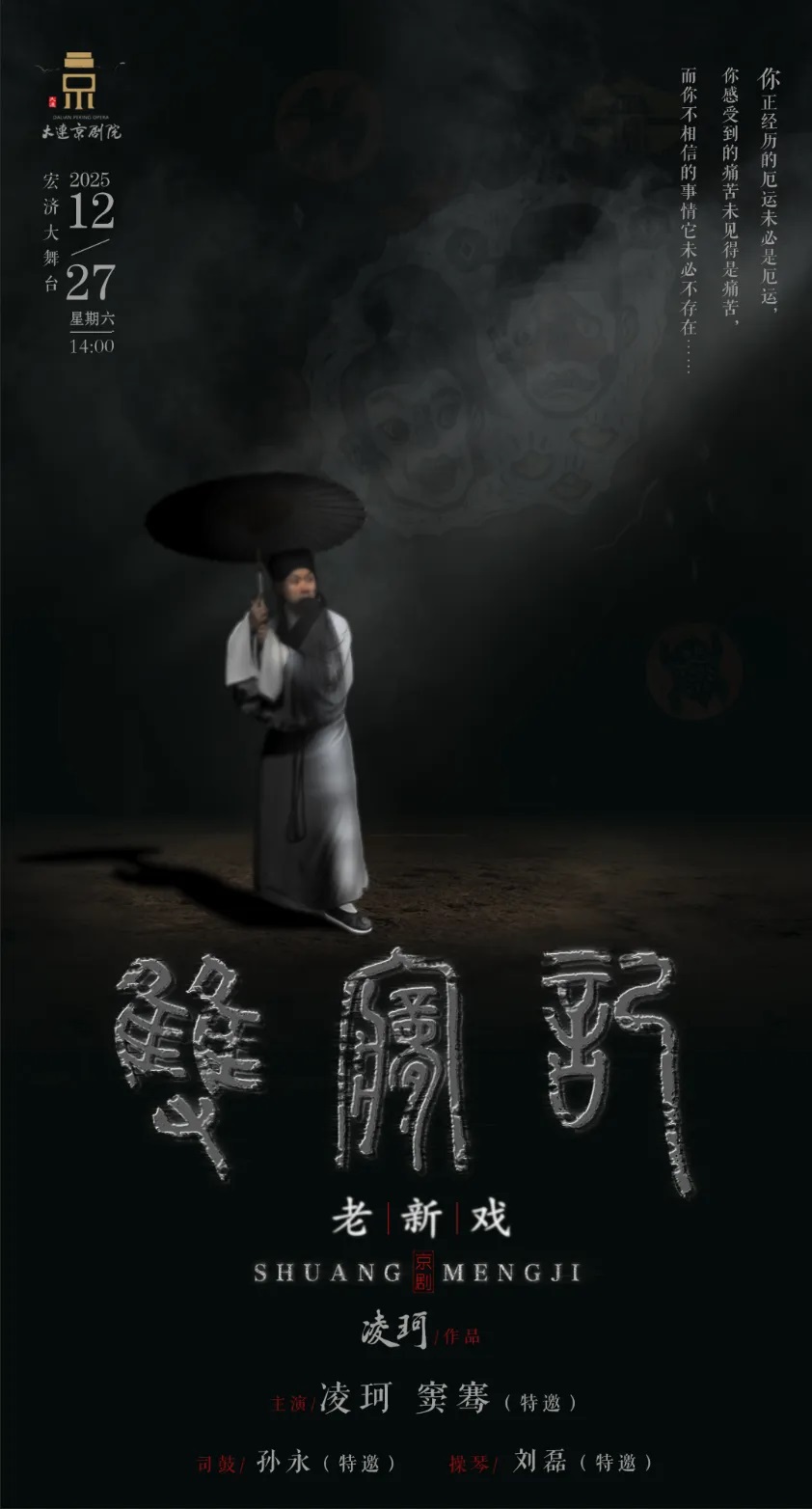 2025全国小剧场京剧“群英会”刚刚在北京圆满闭幕,我院余派老生名家凌珂自编自演的京剧《双梦记》作为参演剧目,在京掀起观剧热潮。演出以京剧传统风格贯穿始终,唱、念、做、舞样样精湛,不仅赢得了现场观众的一致赞誉,更出现了“一票难求”的火爆场面,成为本届“群英会”中备受瞩目的亮点。12月27日14:00,这部载满京城赞誉的佳作,将在宏济大舞台精彩上演!