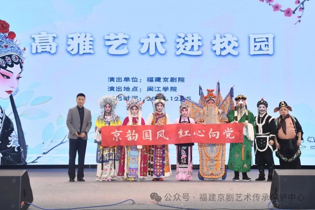 国粹流芳韵,青春绽芳华。为传承中华优秀传统文化,厚植青年学子家国情怀,践行“京韵国风 红心向党”党建品牌使命,12月15日晚,福建京剧院高雅艺术进校园活动在闽江学院融侨文体中心温情启幕,以经典京剧展演、文化知识普及与互动体验相融的形式,为闽院学子献上一场浸润心灵的国粹盛宴,让梨园雅韵在青春校园落地生根。此次进校园活动,是院团立足党建品牌建设,推动高雅艺术普及、培育青年文化自信的生动实践,以经典剧目为桥,让学子在笔墨丹青般的戏曲意境中,感受传统文化魅力,汲取精神力量。