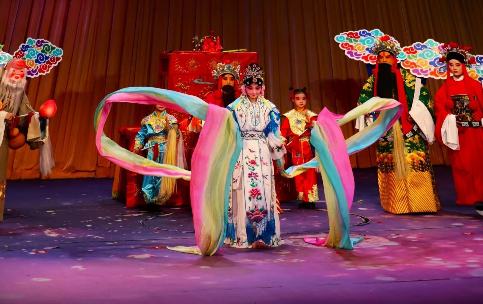 开场“灵官祈福”,京剧演员扮作各路神仙登台,为江城百姓纳福添喜;在“童儿扫台”环节中,小演员以京剧程式化动作“清扫”舞台,寓意扫除旧岁尘埃,迎接新年新章;“加官送喜”与“财神献瑞”环节中,小演员手持吉祥条子与金元宝,走下舞台为观众送上好运和甜蜜。